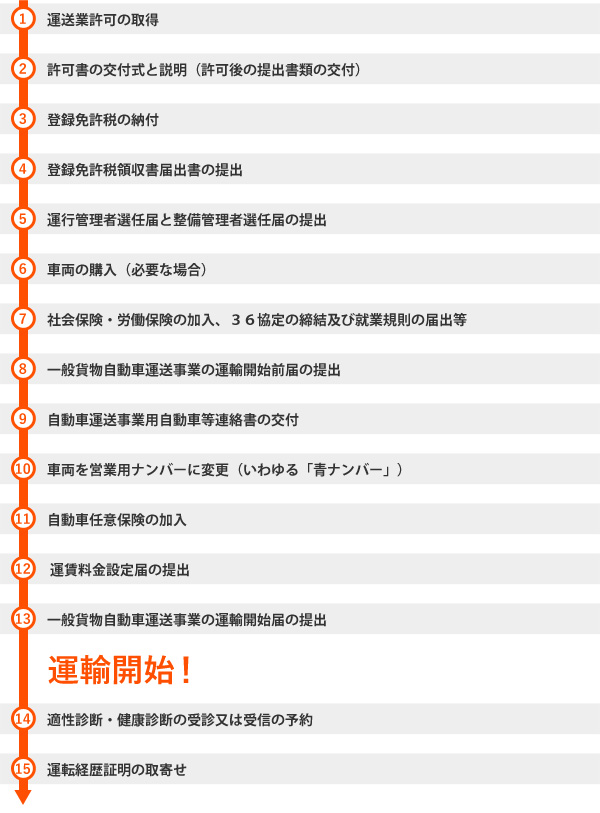 一般貨物自動車運送事業の許可取得後も、定められた書類の提出等の手続きがたくさんあります。それらをすべて完了して、初めて営業を開始することができます。